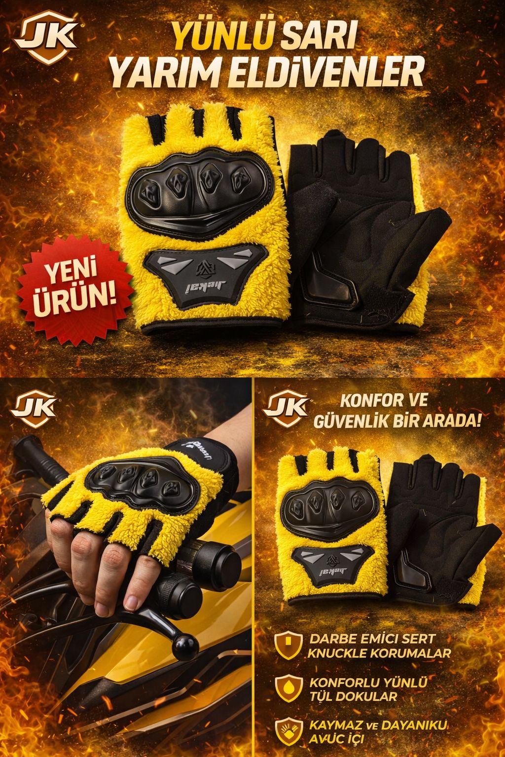 JK Peluşlu Yarım Eldiven – Sarı, sıcak tutan yapısı, konforu ve enerjik görünümüyle stoklarımıza girmeye hazırlanan öne çıkan bir üründür. Hem güvenli sürüş hem de stil sahibi bir kullanım arayanlar için ideal bir tercihtir.